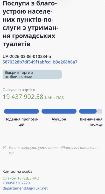 Загальна очікувана вартість закупівлі становить 19 437 902,58 грн. За ці кошти підрядник має забезпечувати чистоту об’єктів до кінця 2026 року. Згідно з документацією, обслуговуванню підлягають майже 9 тисяч біотуалетів. Технічне завдання включає не лише очищення поверхонь від бруду та написів, а й забезпечення вбиралень милом, туалетним папером та дезінфікуючими засобами.